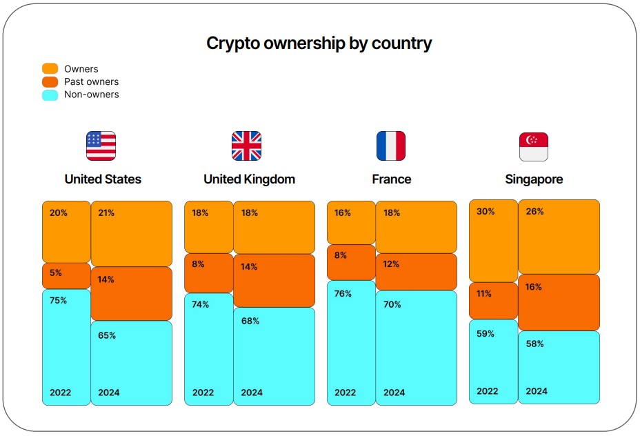 Despite the volatility that slashed the combined value of the top 100 cryptocurrencies from $2.7 trillion in 2021 to $830 billion by late 2022, ownership rates in the US, UK, France, and Singapore have remained consistent. Around 21% of adults in the US and 18% in both the UK and France reported owning crypto. Notably, Singapore saw a slight dip in ownership from 30% to 26%.