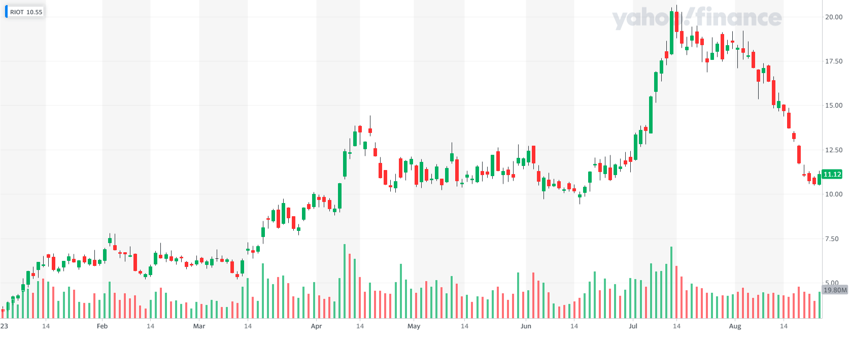 Looking at Riot Platform's (NASDAQ: RIOT) chart, we see that the price is testing at over two-month lows and has fallen almost 50% from the July highs. The company has still gained over 200% since the beginning of the year but has had to part with a significant portion of its profits realized since January.