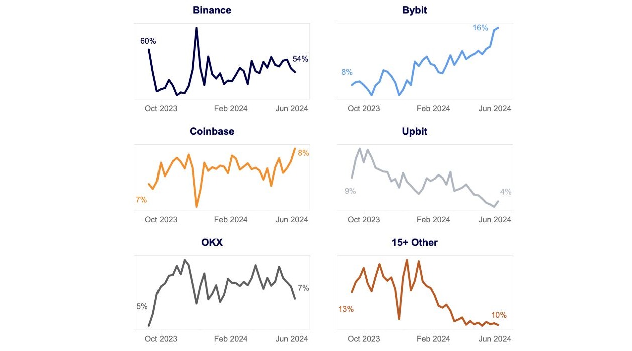 In detail, Bybit–which is headquartered in Dubai and was founded in 2018–has, from October last year to this June, seen its market share double from 8% to 16%, while Binance’s share has dropped over the same time period from 60% to 54%. Coinbase registered a modest 1% gain, rising overall from 7% to 8% (meaning, as respective market shares fluctuated, that Binance climbed above Coinbase in March), and OKX experienced a 2% gain from 5% to 7%. Simultaneously, Upbit dropped from 9% to 4%, and over fifteen smaller exchanges endured a collective drop from 13% to 10% of market share.