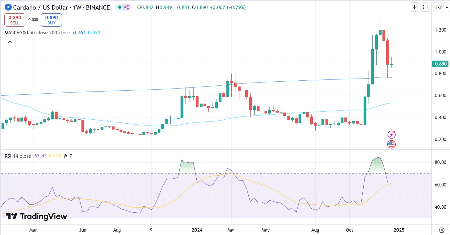 On the weekly chart, ADA price is above the 50 and 200 moving averages amid a steep price correction. RSI is at 63, meaning the price momentum is generally positive and is not yet at the overbought zone.