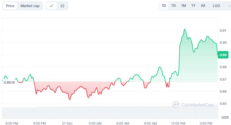 At the time of publication, ADA traded at $0.8948, with double-digit growth in trading volumes. In the past 24 hours alone, Cardano’s trading volumes were up 23% to $856 million.