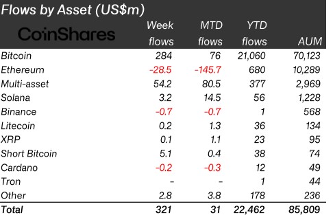 • Bitcoin attracted the most significant inflows of $284 million, while short-bitcoin investment products also gained interest.