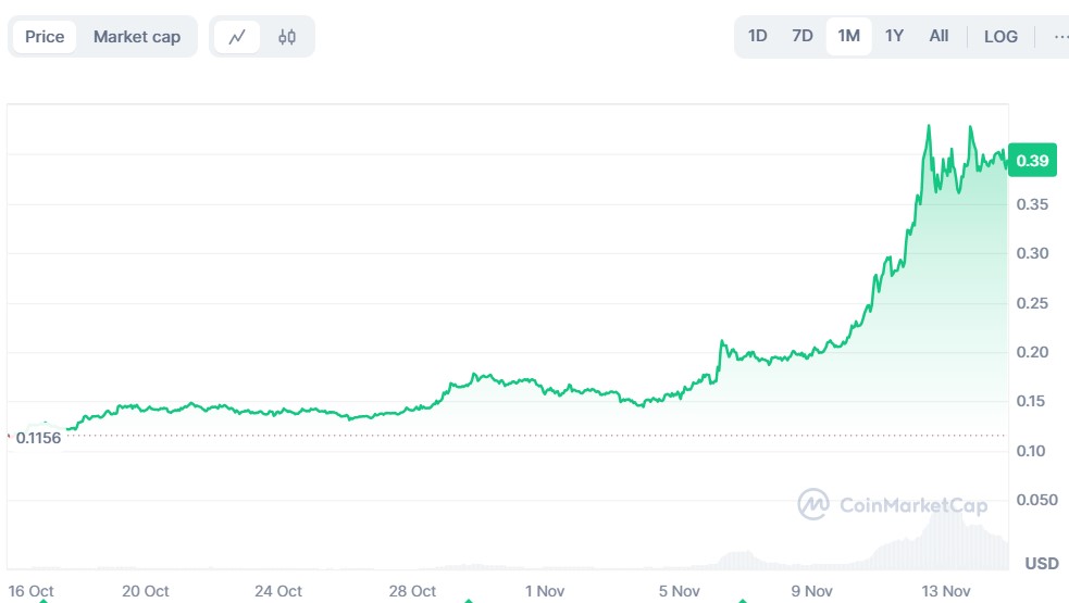 DOGE was one of the cryptocurrencies that led the recent crypto rally. The meme token, which was created in 2013 from a dog meme, now ranks sixth in the crypto asset list with a valuation of $58 billion. At the time of writing, the meme token was trading at $0.3977 after soaring over 105% in the weekly chart.