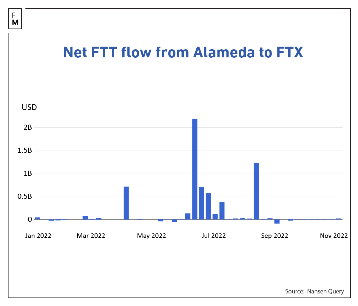 Following the collapse of Terra LUNA and the bankruptcy of Three Arrows Capital (3AC), Alameda found itself in a liquidity crisis due to a drop in the value of FTT. Nansen's on-chain data revealed that approximately 163 million FTT tokens, valued at around $4 billion at the time, were transferred from Alameda to wallets during the collapse of 3AC in June last year.