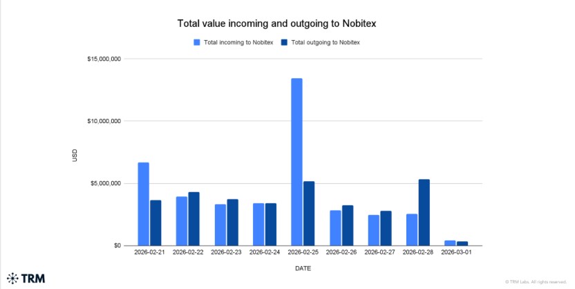 TRM Lab's analysis shows that Iran’s largest exchange, Nobitex, recorded around $3 million more in combined inflows and outflows around the strikes. However, these movements remain within its historic operating range and likely reflect internal treasury shifts rather than capital flight.