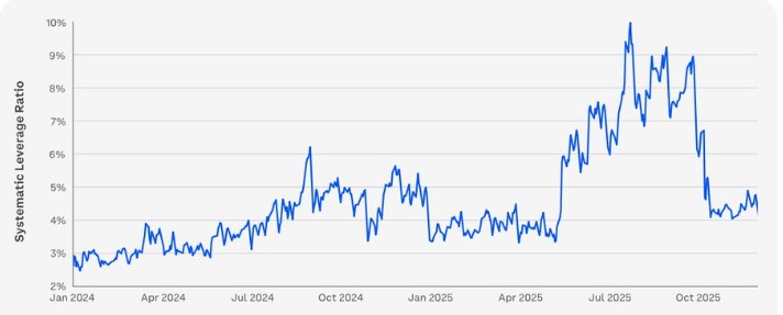 The ability to control large positions with minimal capital renewed interest in leveraged trading, pushing speculative exposure to nearly 10% of crypto’s overall leverage ratio before a sharp correction in October brought it back down to 4%.