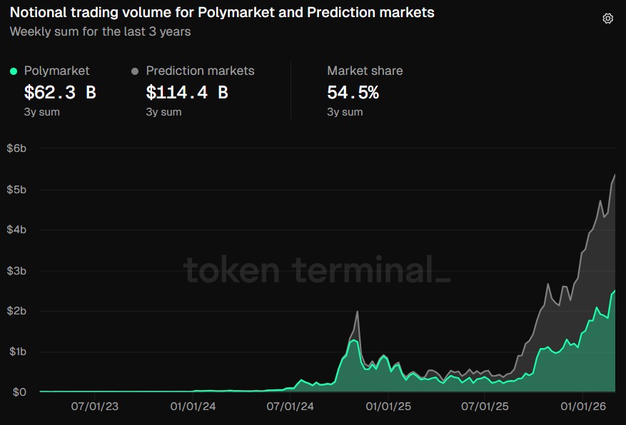 Polymarket has generated 62.3 billion dollars in notional trading volume over the past three years, giving it a 54.5% share of the 114.4 billion‑dollar prediction markets segment tracked by Token Terminal.