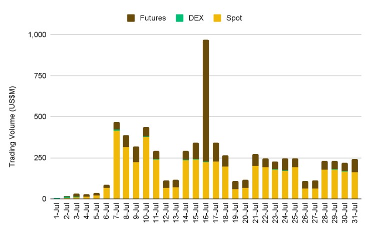 Tokenized stocks volumes experienced notable growth in July, Source: Binance