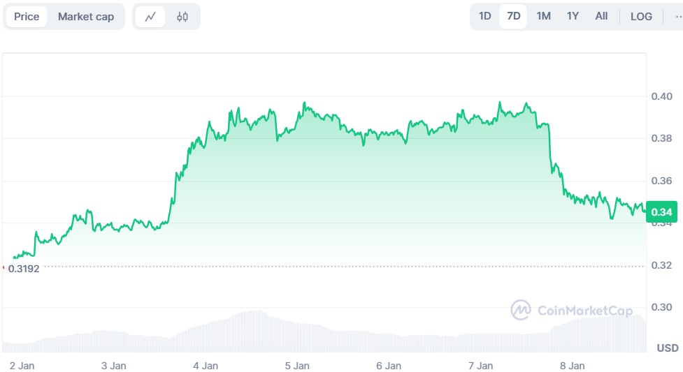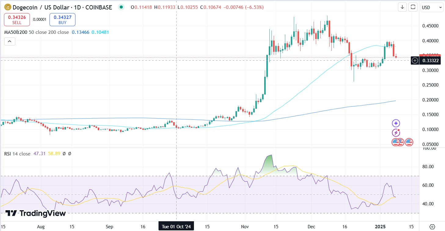 Dogecoin's current price action aligns with a classic bull flag pattern. On the daily chart, the price is currently below the 50-moving average, although it remains above the $200 moving average. The price dropped from $0.3950 on Jan 5 to $0.3439.
