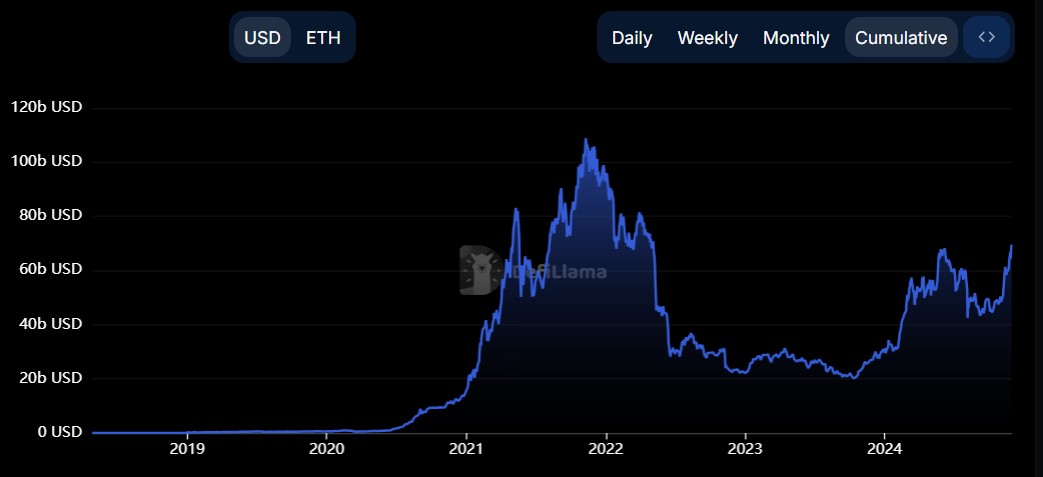 This optimism is further fueled by the network's dominant role in decentralized finance (DeFi), where it commands over half the total value locked across all platforms. Data from DefiLlama shows that Ether has nearly $70 billion in TLV, although slightly lower from 2021's more than $100 billion.
