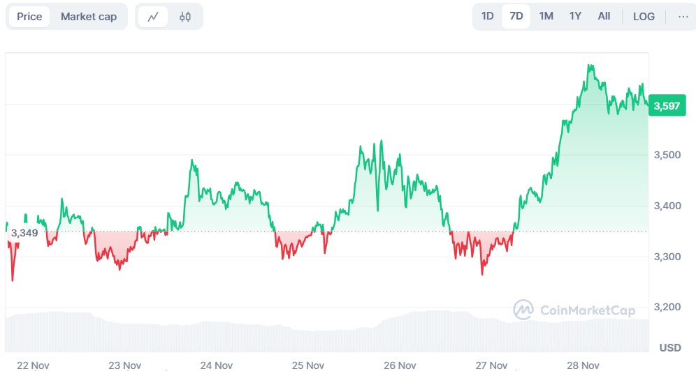 Ethereum (ETH), the second-largest cryptocurrency after Bitcoin, has experienced significant gains lately, even as other digital assets retreat from the recent market rally. CoinaMarketCap's data shows that ETH is currently trading at $3,635, up 5% and 10% in the past day and week, respectively.
