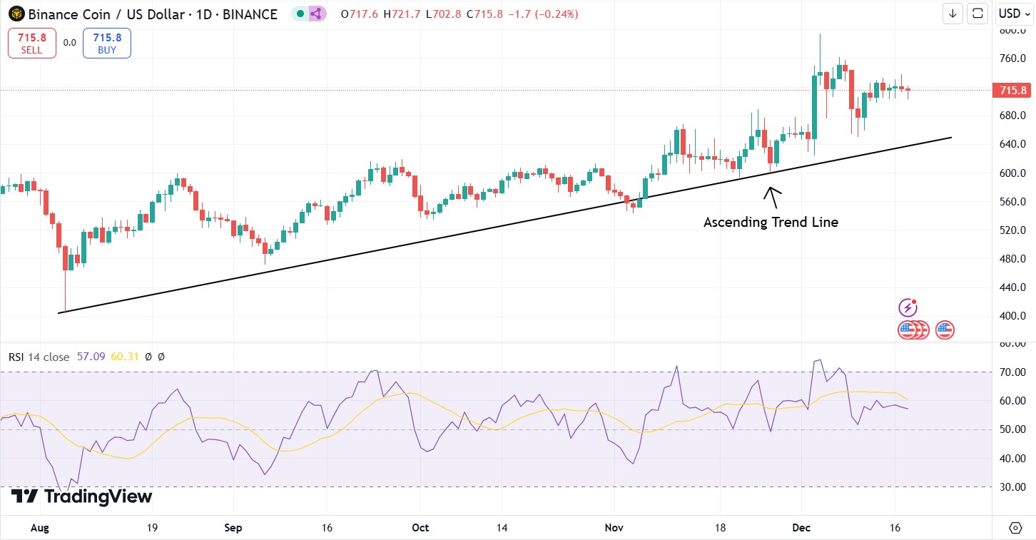 Technically, BNB is on an upward trend and could claim a higher price level despite the legal challenges. Although the price could potentially retreat to the trending line, it is still below the overbought zone. This is based on TradingView's Relative Strength Indicator (RSI), which is currently at 56. Whether BNB could reach $1,000 depends on strong fundamentals and the overall positive crypto sentiment.