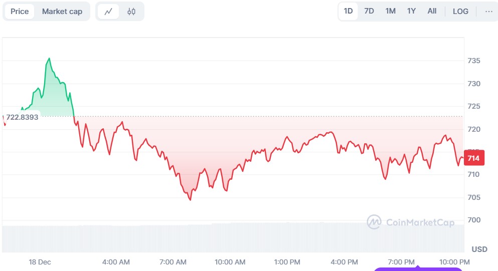 Currently ranked sixth with a market capitalization of $103 billion, the digital asset is changing hands at $717 behind Solana, which traded at $216 at the time of publication with a slightly higher market capitalization.