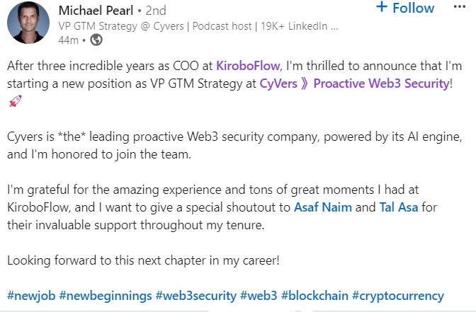 Michael Pearl, the Chief Operating Officer of the blockchain firm KiroboFlow, has moved to Cyvers as the VP for GTM Strategy.