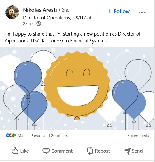 In a recent announcement on his LinkedIn profile, Nikolas Aresti revealed his new role as the Director of Operations, US/UK at oneZero Financial Systems. Aresti expressed his enthusiasm for the opportunity, marking a milestone in his career trajectory within the financial technology sector.