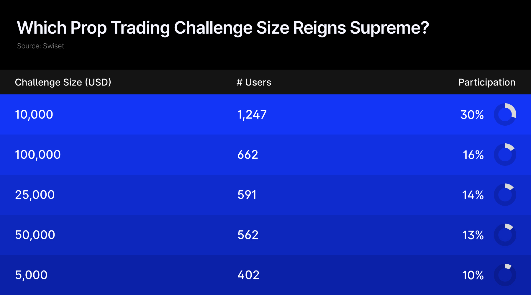 Traders flocked to the $10,000 challenge—nearly 30% of users chose this category, making it the most popular option. The $100,000 and $25,000 challenges followed. Preferences varied by region: South Americans favored the $10,000 and $25,000 levels, while North Americans leaned toward larger $100,000 and $200,000 accounts.