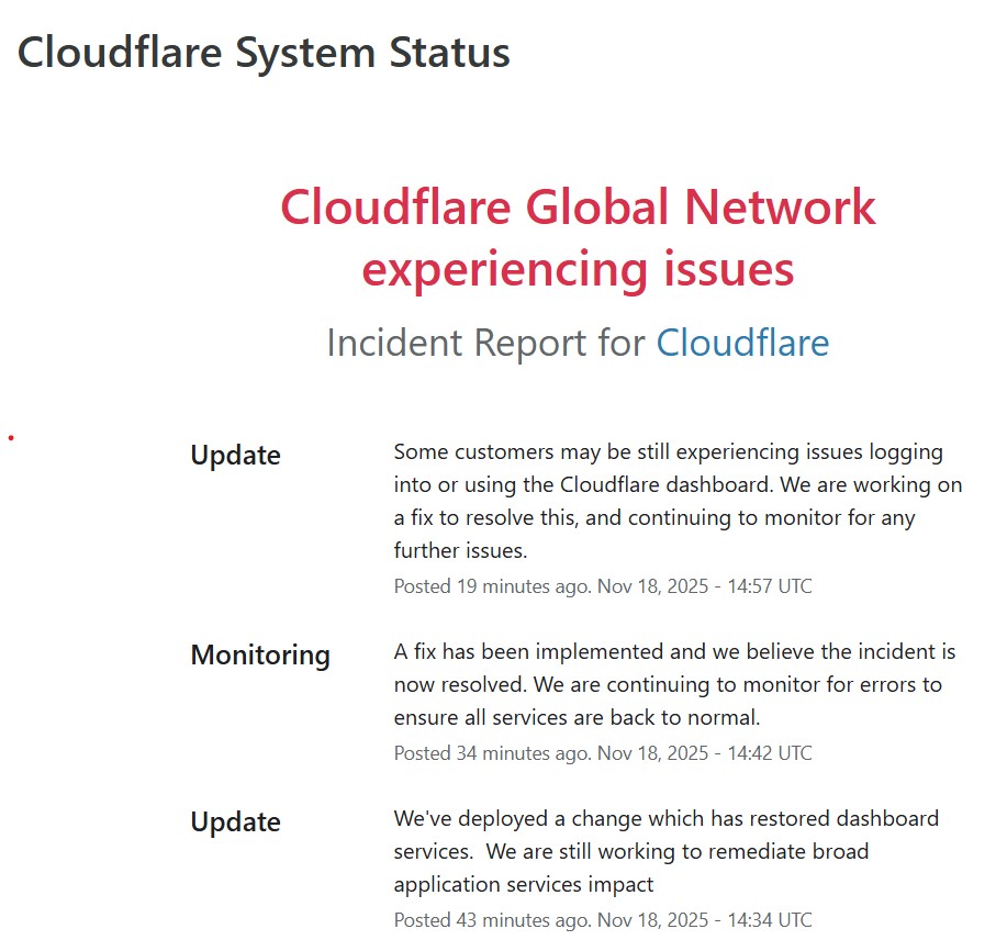 • Cloudflare later announced it had implemented a fix, and services gradually began returning to normal.