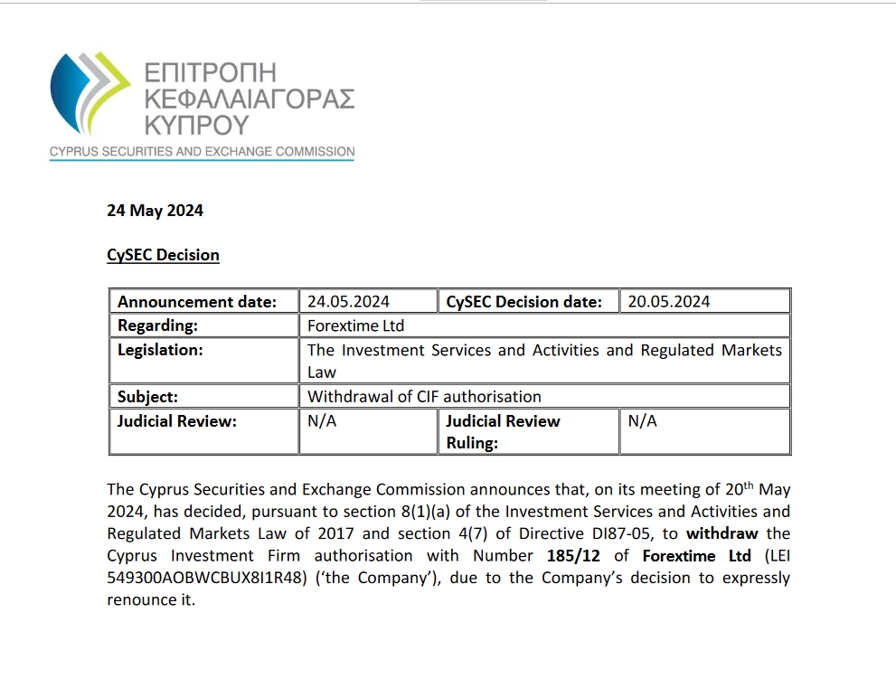 The Cyprus Securities and Exchange Commission (CySEC) announced today (Friday) its decision to withdraw the Cyprus Investment Firm (CIF) authorisation of Forextime Ltd (FXTM), effective from May 20, 2024. This decision was made during CySEC's meeting held on the same date.