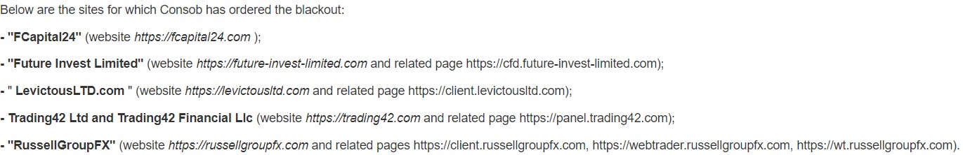 Consob has blocked five websites suspected of offering illegal financial services to investors. These websites include FCapital24 (fcapital24.com), Future Invest Limited (future-invest-limited.com or cfd.future-invest-limited.com), and LevictousLTD.com (levictousltd.com).