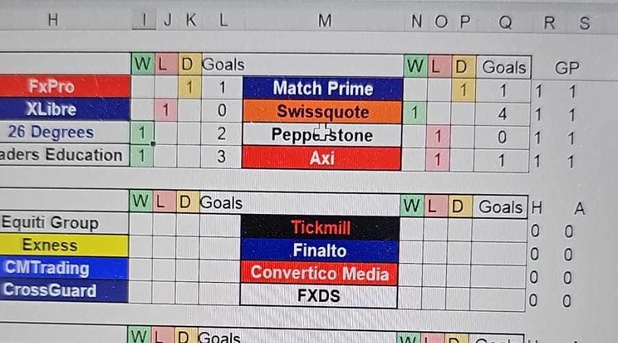 In Group A, FxPro, Equiti Group, Tickmill, and Match Prime tied with a point each. Looking at Group B, Finalto and Swissquote led with three points each.