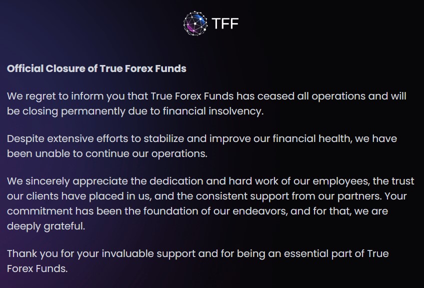 True Forex Funds has ended its operations and announced plans to permanently close due to financial insolvency. According to a statement on the proprietary trading platform’s official website, the firm was unable to improve its financial situation, leading to the discontinuation of its services.