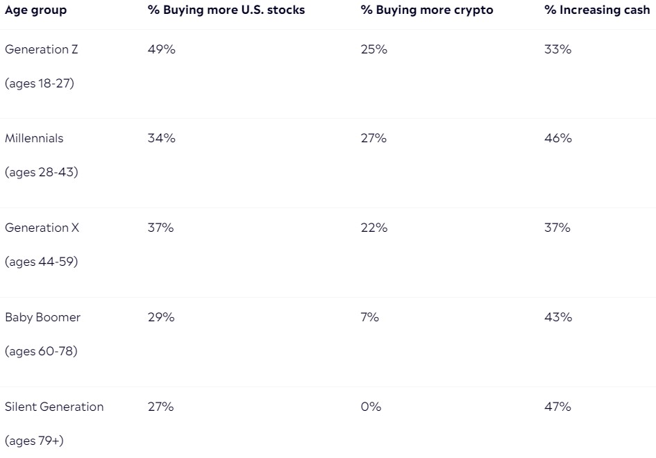 Millennials and Gen Z are increasingly buying stocks, with almost half of Gen Z (49%) doing so. Older investors, including Boomers (43%) and the Silent Generation (47%), are focusing on increasing cash allocations instead.