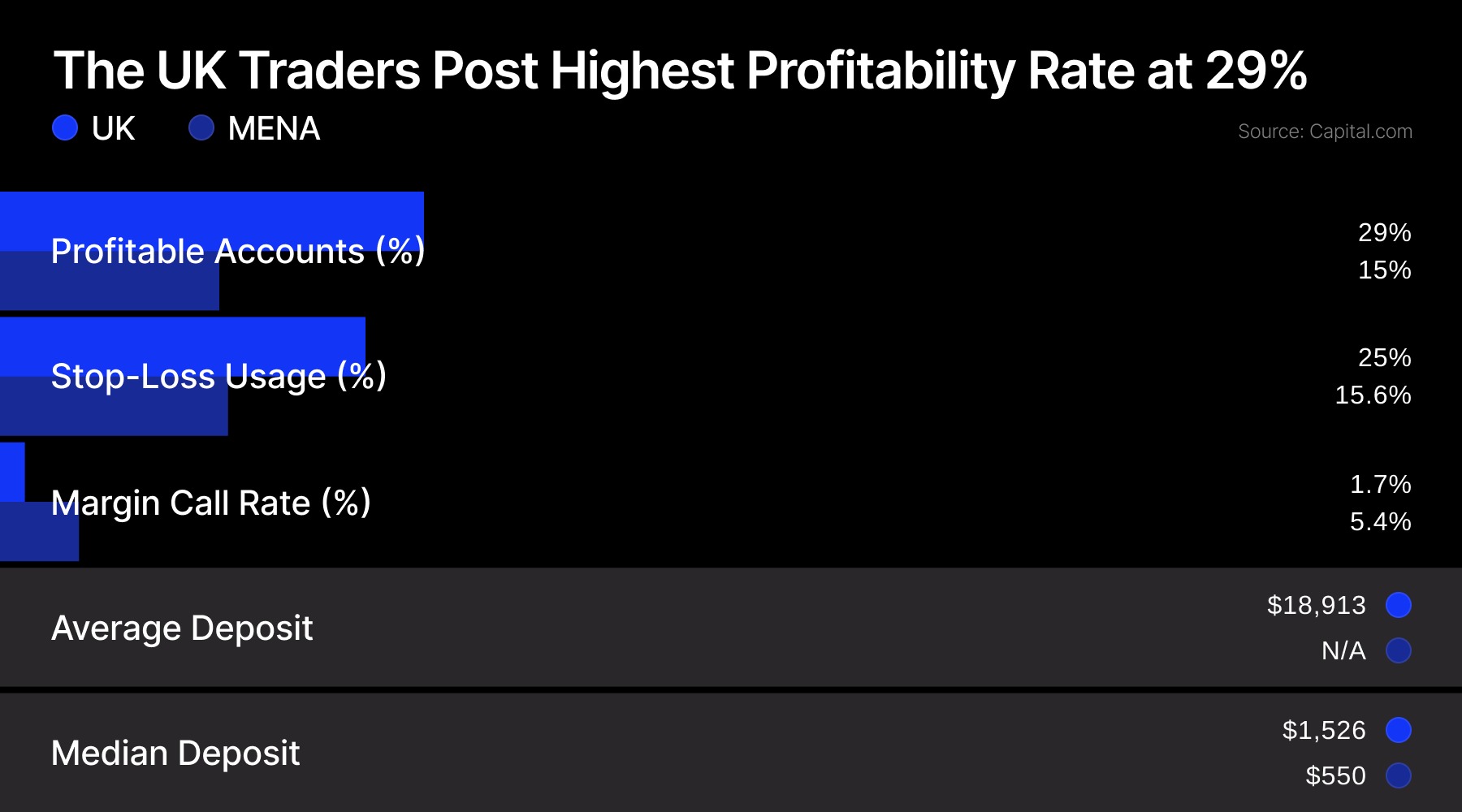 And to some interesting findings: British retail traders use stop-loss orders 60% more often than traders in other regions, contributing to a higher account profitability rate of 29%, according to Capital.com data from May 2023 to May 2025.