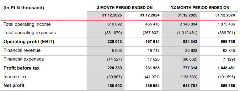 According to the preliminary results released Thursday, total operating income rose 15% year‑on‑year to PLN 2,146.8 million, up from PLN 1,873.4 million in 2024. This was boosted by a 70% increase in active clients to 1,189,422 and a 41.3% rise in CFD volume to 8,866,381 lots.