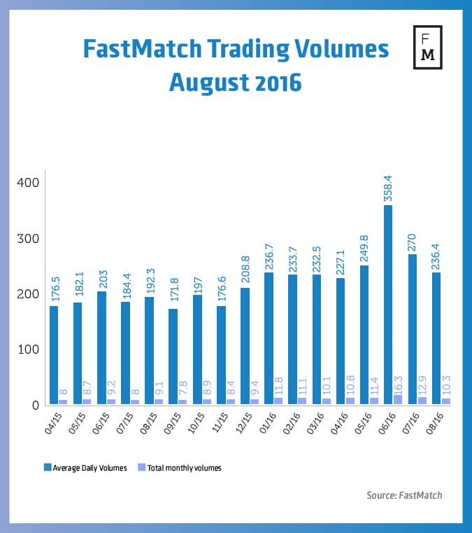 August trading volumes at Fastmatch have decreased by 12.4 per cent on a nominal basis to $236.4 billion. The figure remained higher year-on-year by about 18.6 per cent, which is a testament to the increasing appeal to Fastmatch’s offering and the weathering of the post-SNB storm for the company.