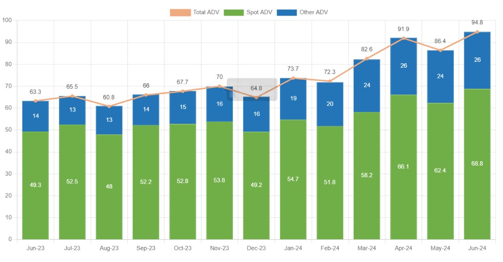 The spot ADV rose 10% from USD $62.4 billion to USD $68.8 billion in June. Similarly, other ADV jumped 8% from USD $24 billion to USD $26 billion. The platform's total ADV was USD $94.8 billion, a 9.7% increase from USD $86.4 billion in May.