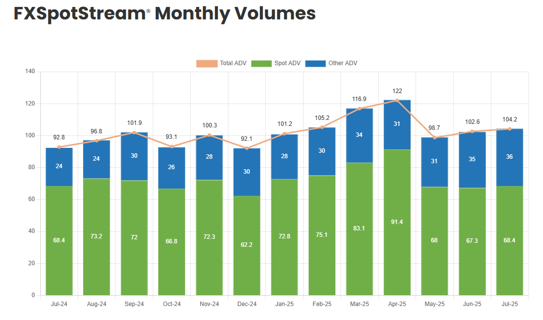 FXSpotStream posted more encouraging numbers, with total ADV reaching $104.2 billion compared to June's $99.8 billion. The platform's spot ADV hit $68.4 billion, while other products contributed $36 billion to the daily average.