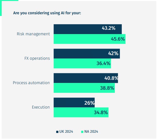 UK corporates are also diversifying their strategies by turning to FX options. The report found that 64% of finance leaders are now using FX options more frequently. At the same time, technology is playing a key role in reshaping FX management. All respondents in the MillTechFX report indicated that they are exploring the potential of artificial intelligence (AI) and automation in their FX operations.