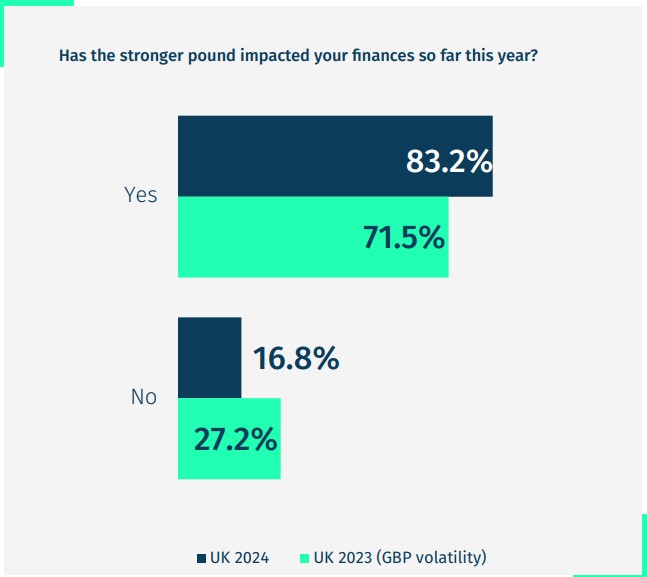 According to the study by MillTechFX, 83% of UK corporates reported that the stronger pound has affected their finances. Interestingly, the effects are evenly split, with 50% seeing positive results and the other half experiencing negative impacts.