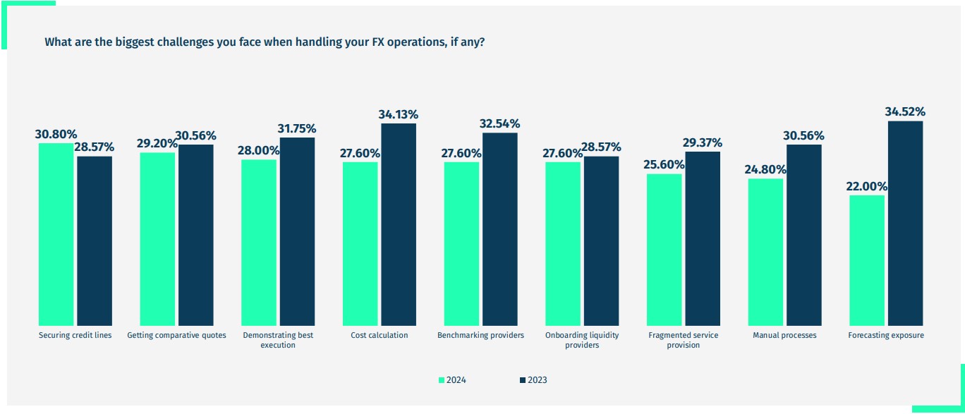 Securing credit lines has emerged as the foremost challenge among companies, with 31% of corporates citing it as their top concern. This shift reflects tighter risk appetites among providers and escalating costs, which have forced many firms to seek alternative quotes.