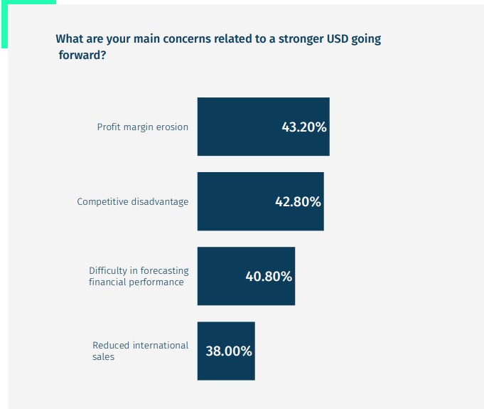 The report noted that a strong dollar continues to exert pressure on corporate bottom lines, with nearly all respondents expecting the dollar to appreciate further. This trend raises alarms about profit margin erosion and competitive disadvantage, compelling CFOs to rethink their FX strategies.