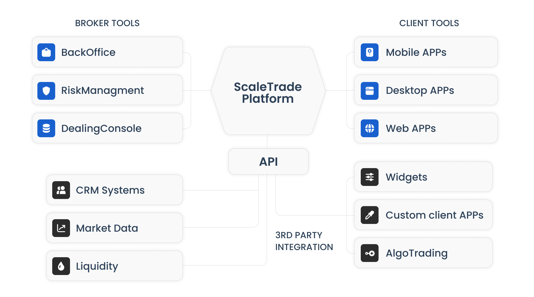 This includes the ScaleTrade Trading Platform with cross-platform terminals, integrated CRM for brokers with client portal, marketing tracking modules, price feeds, risk management softwares, and liquidity connections. Everything a broker needs to operate both legally and competitively.