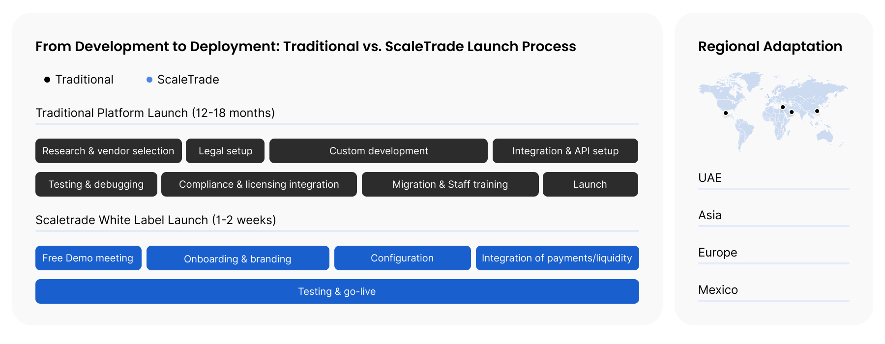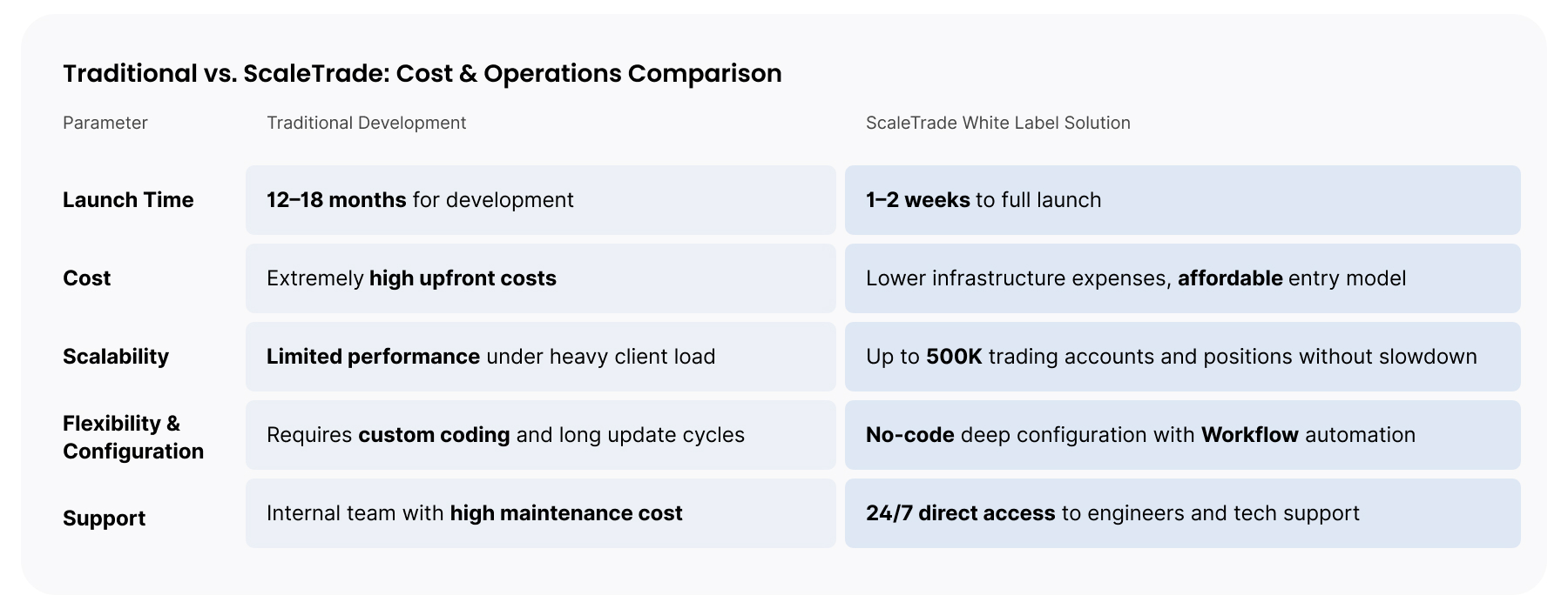 Traditional platform development requires 12-18 months and hundreds of thousands of dollars in infrastructure costs. ScaleTrade compresses both timelines and capital requirements, allowing brokers to launch on modest budgets and scale as revenue grows — instead of betting everything upfront.