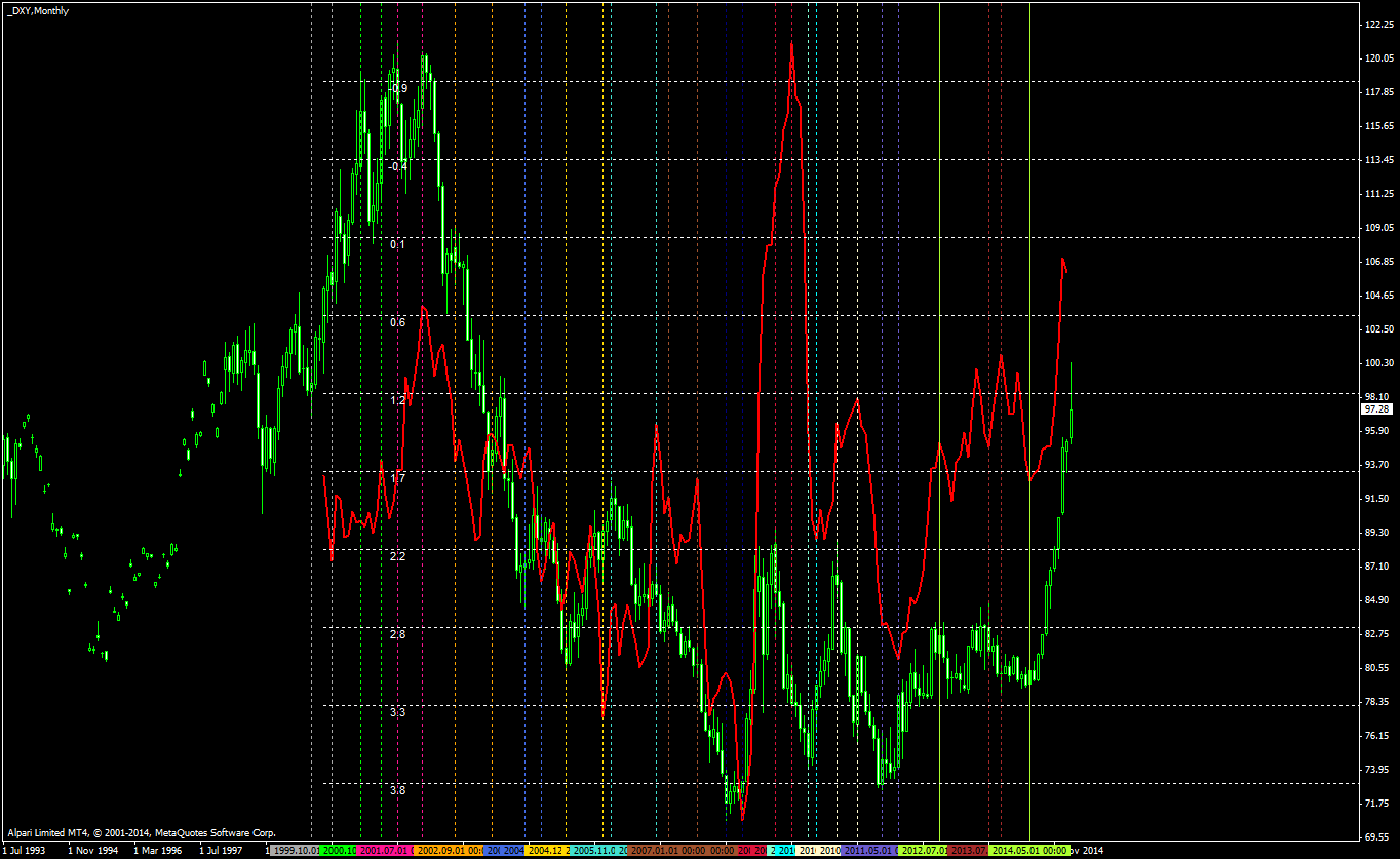 For comparison, here is the CPI chart overlaid over the USDX chart. The CPI data is taken from the Federal Reserve Bank of St. Louis and loaded into MetaTrader using the Data-Loader indicator. The combined chart spans for the period between January 2000 and February 2015. Both data series are in their monthly values, CPI is the yearly change for a given month and is shown inverted: