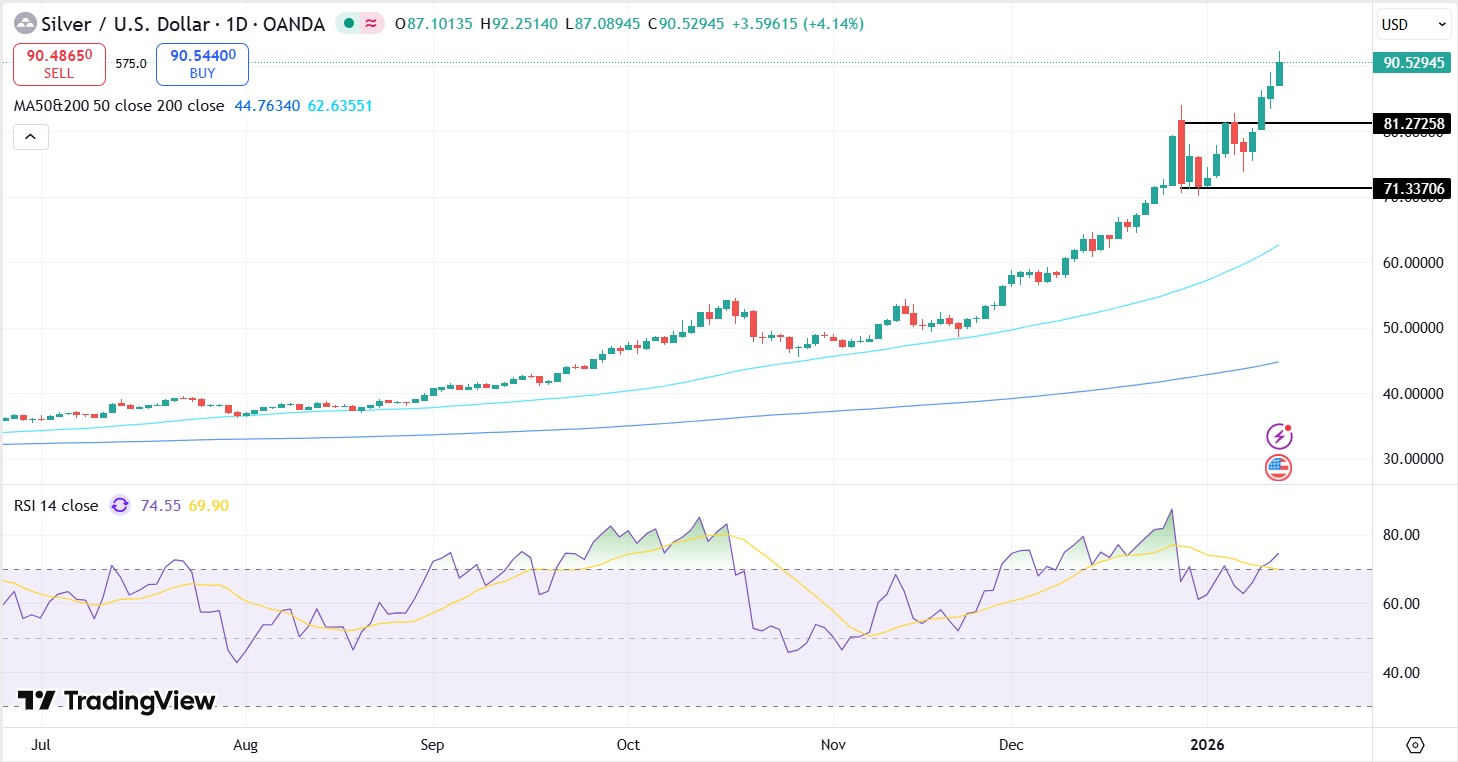 Silver traded around $88 on Tuesday, up about 3% on the day and above the previous record just over $86 set on Monday.
