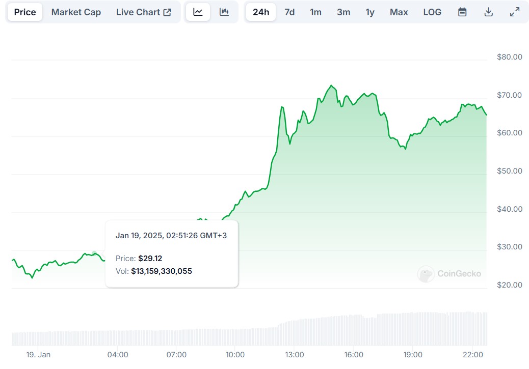 Despite its symbolic intent, $TRUMP quickly gained traction among traders. Data from CoinGecko shows that $TRUMP has amassed a market capitalization of more than $13 billion. At the time of this publication, the memecoin traded at $67, representing a 139% surge in the daily chart.