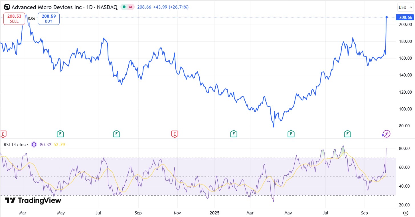 AMD shares surged 38% on Monday after the chipmaker sealed a multi-year deal to supply advanced AI processors to OpenAI, the company behind ChatGPT.