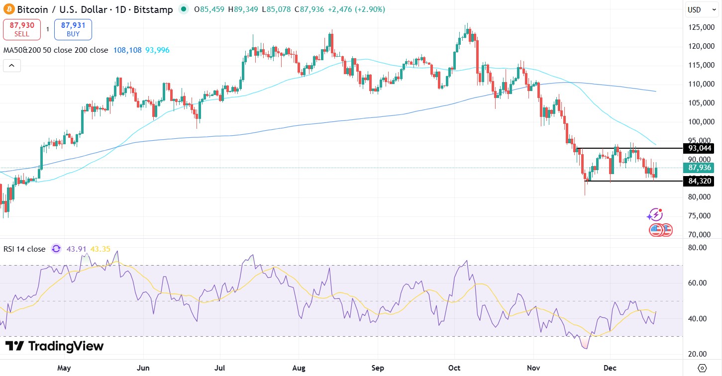 Technically, Bitcoin is in a consolidation, trading at around a price range last seen in April. The price is locked in within a support of $84,320 and a price resistance of $93,044. The RSI is neither in the overbought or at the oversold conditions.