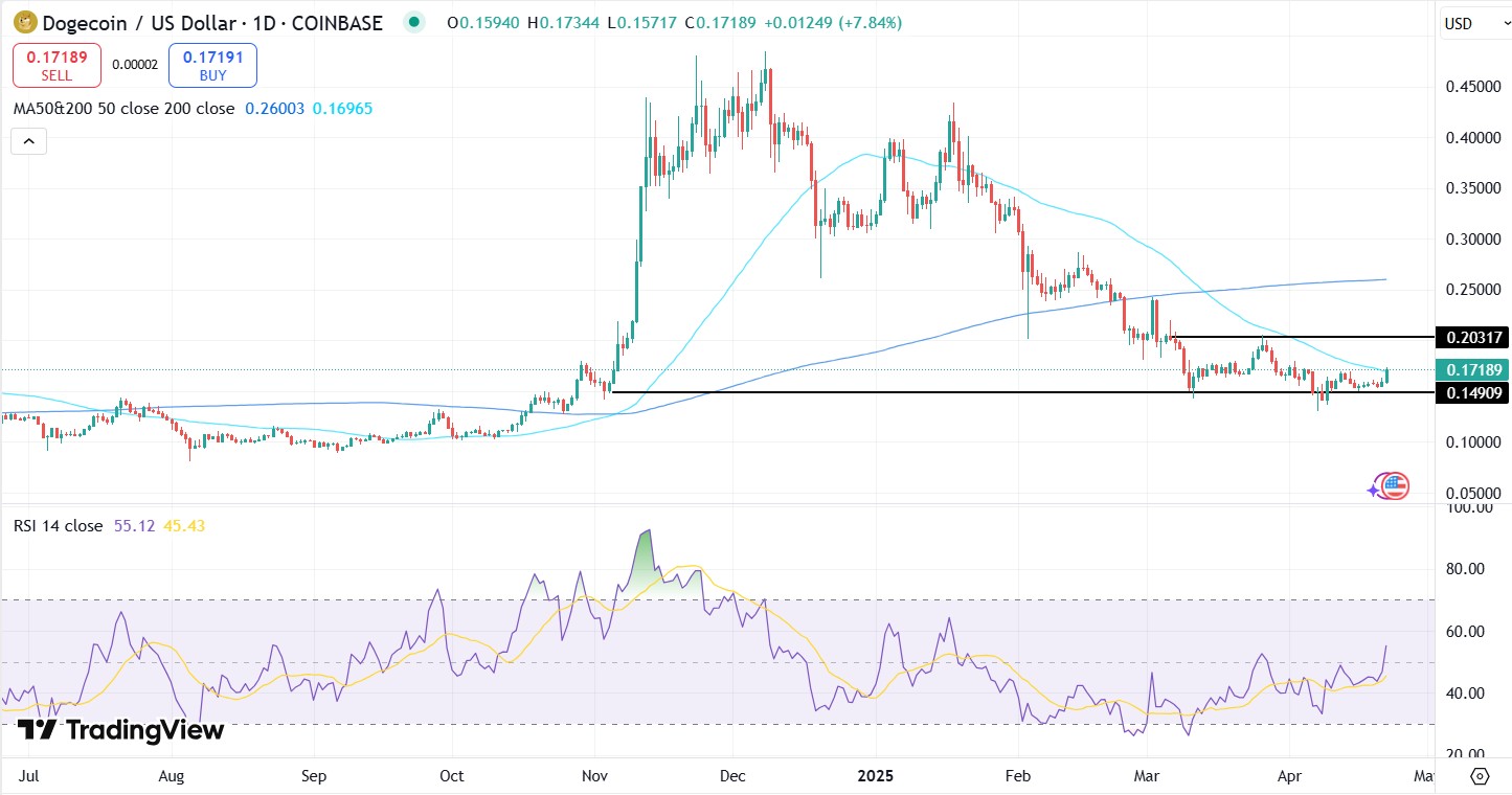 Technically, DOGE faces key resistance levels. Price is currently at the 200 moving average but below the 50 moving average levels. The Relative Strength Index (RSI) is above the neutral 50.