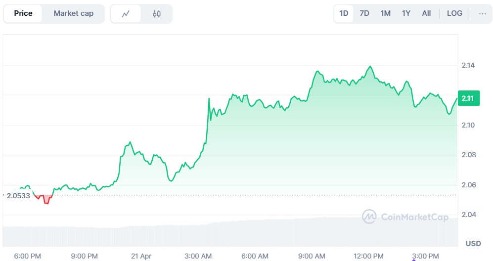 While Ripple gains institutional traction, XRP’s price paints a more complex picture. Trading at $2.11 with a daily gain of 3%, the token sits at a technical crossroads. Volume has jumped 43% to 2.29 billion in the last 24 hours.