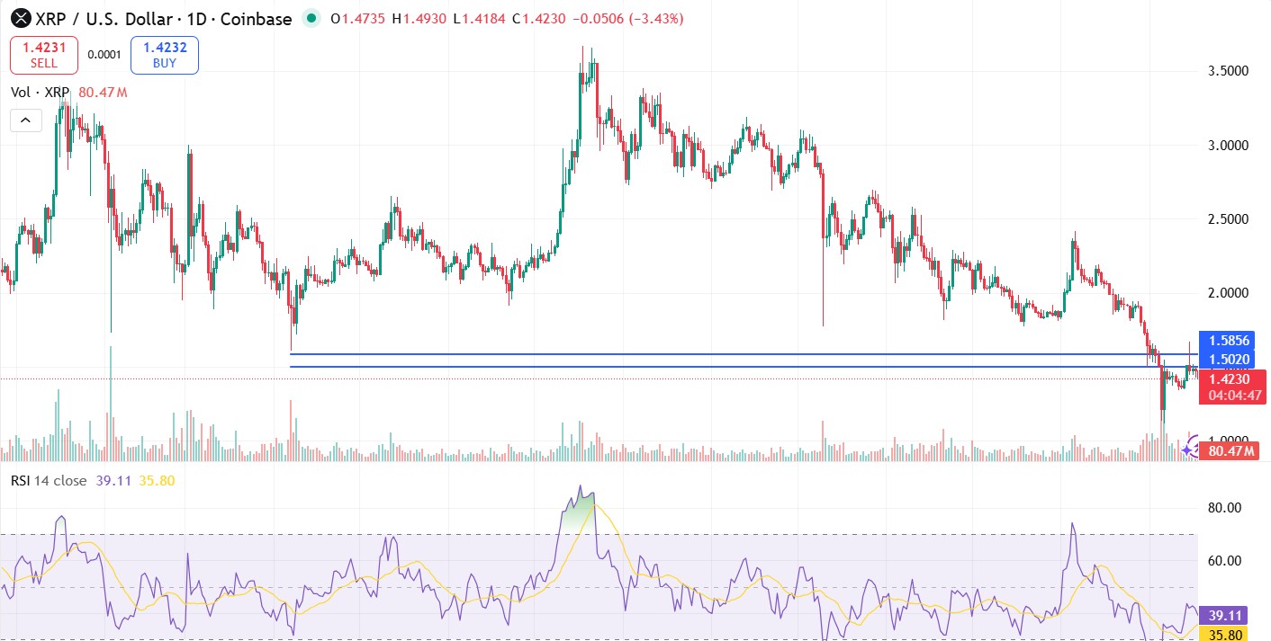 On the daily chart, short-term momentum remains positive as price holds above recent intraday lows near $1.45, while immediate resistance appears near the recent 24‑hour high around $1.49 and then the psychological $1.50–$1.55 zone.